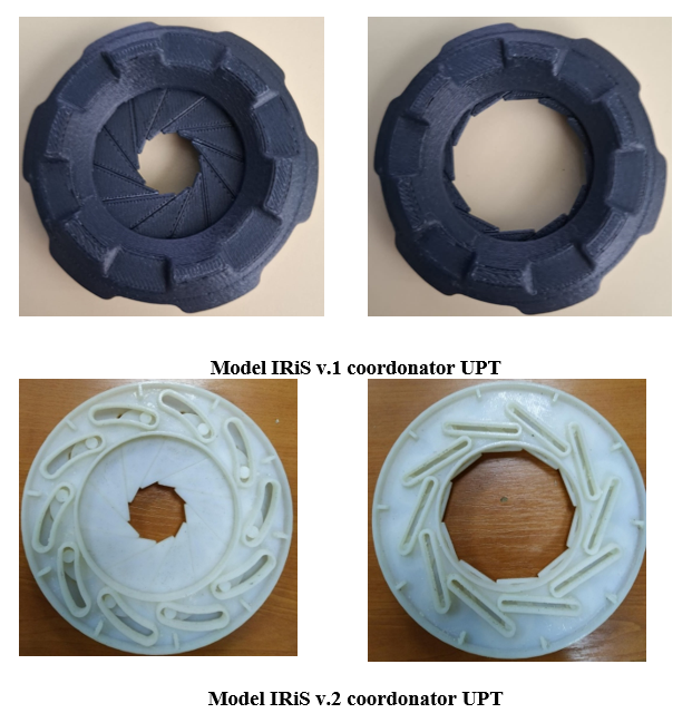 Primul model la scara redusa IriS v.1 arata modul de functionare. Varianta finala a dispozitivului s-a realizat prin printare rapida 3D in cadrul laboratorului CAD-CAM de la UPT. Modelele au fost realizate conform desenului de executie.